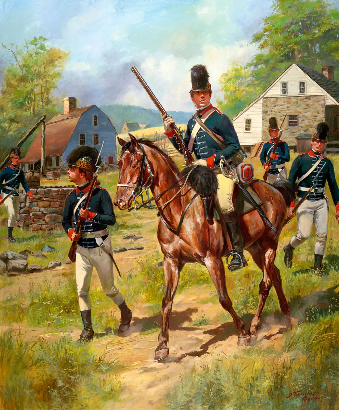 One of the 4 regiments of Continental Dragoons, the 4th saw much service in different theatres of the war. Here we see a Dragoon Trooper & Bugler during the mid-war period with bearskin crested helmet and green coats faced with red.
