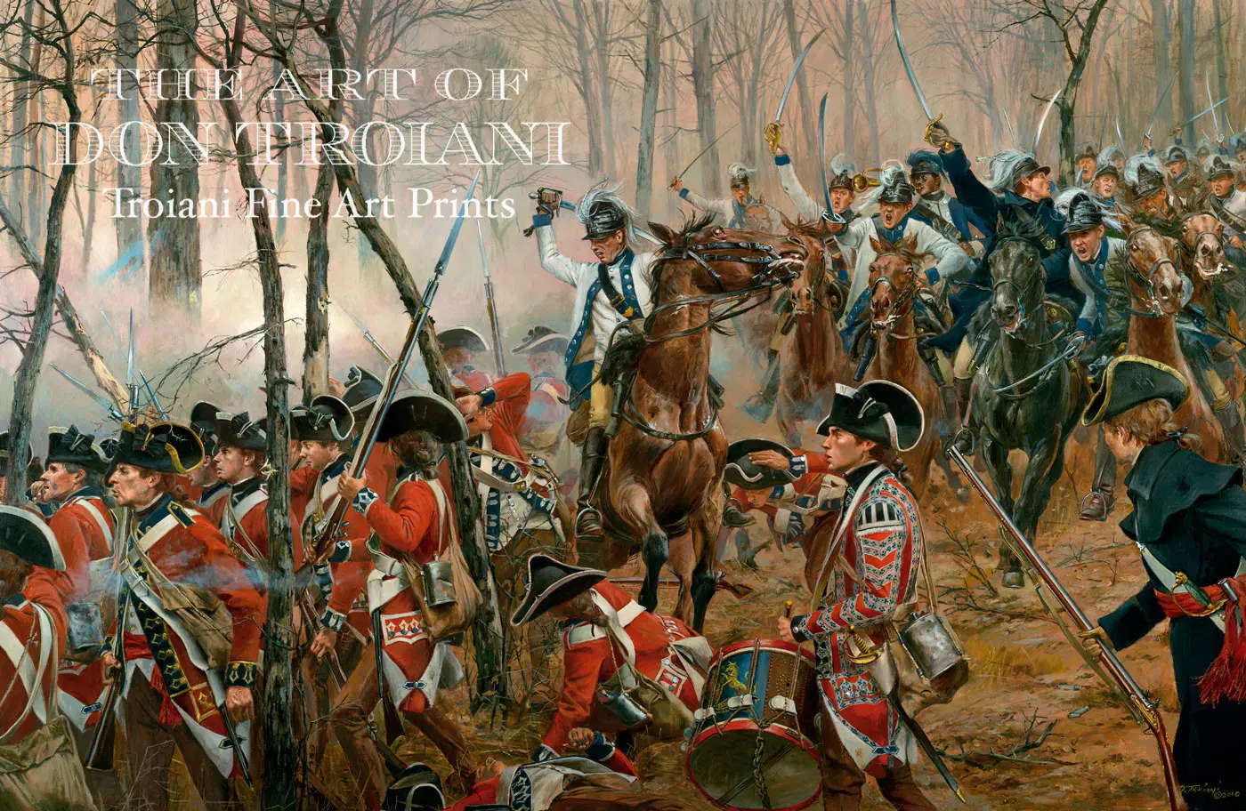 This latest Troiani masterwork brings into focus the pivotal battle of Guilford Courthouse, March 15th 1781. During the crisis of the furious fighting the famed British Foot Guards were embroiled in a close duel with Howard's Marylanders. At the crucial moment William Washington led his force of dragoons through the woods directly into the exposed flank of the Guards who were taken completely by surprise. The confusion created by this brilliant charge helped to allow the Patriots to disengage and survive to fight again.