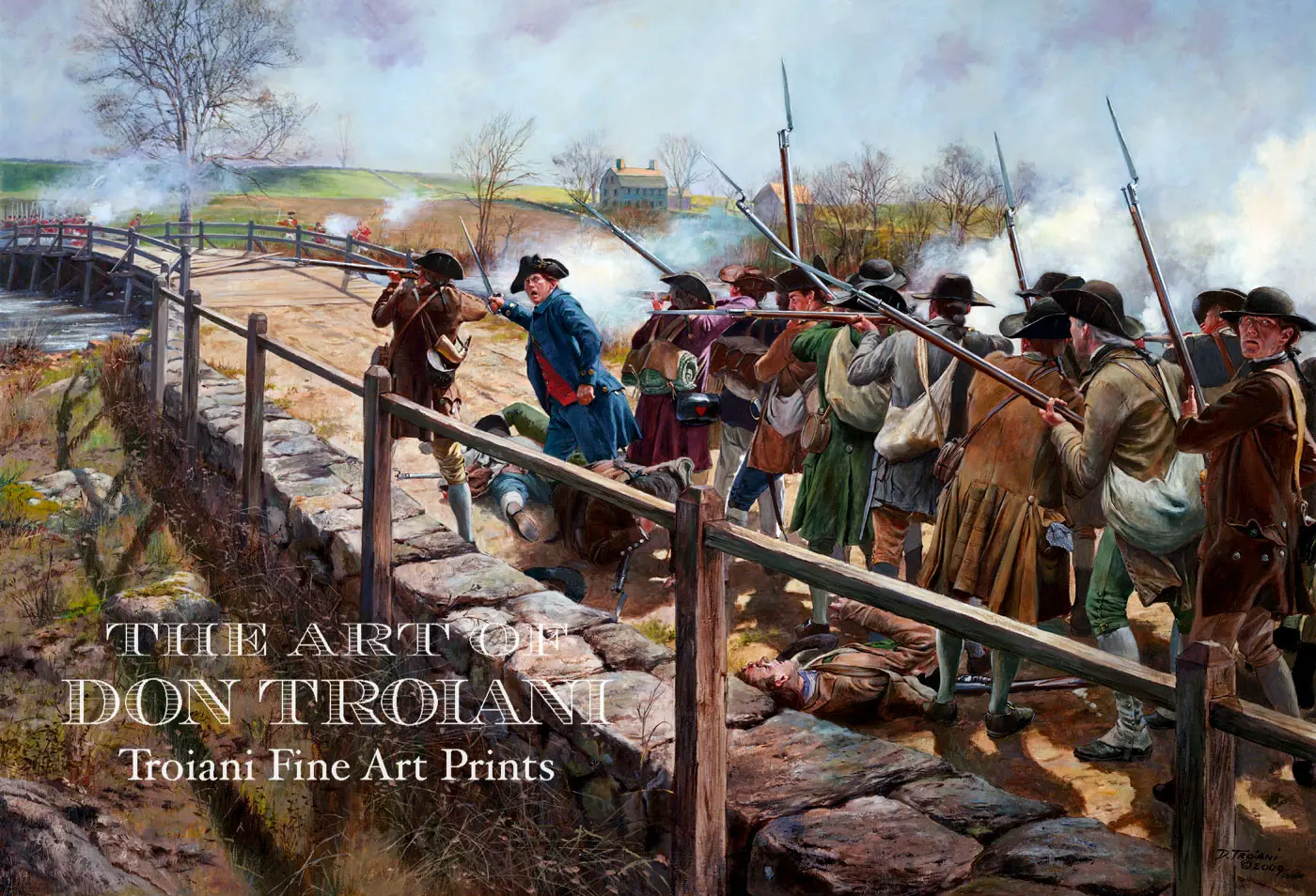 In this latest masterwork, Don Troiani has recreated the momentous scene at Concord Bridge that began the American Revolution and changed the world. Here the Minutemen lead by Maj. John Buttrick face three companies of British Light Infantry across the wooden bridge near Concord, Mass. The Acton Company armed with muskets and bayonets was in the lead as the British opened fire without warning after being warned to stop removing planks from the bridge. Buttrick yelled to his men,"Fire fellow soldiers, for god sake fire!" The fire of the regulars had killed Capt. Davis and Pvt. Abner Hosmer and wounded a few others. Drawn up in column in the roadway before the bridge, the few Americans that could aim without hitting their neighbor heeded Buttrick's command and returned fire. As the Americans deployed and more guns were brought to bear, the British lights withdrew in a panic towards the safety of a column of grenadiers that had marched out of town to reinforce them. As the Redcoats evacuated Concord and its environs, they were followed and flanked by a swarm of angry, buzzing Americans from the nest they had disturbed and were stung badly on their retreat back into Boston, with some 73 British officers and men killed, another 174 wounded, and some 26 missing or captured. April 19th began what would lead to eight years of bloody conflict that would result in the 1783 Treaty of Paris and creation of a new nation, the United States of America.