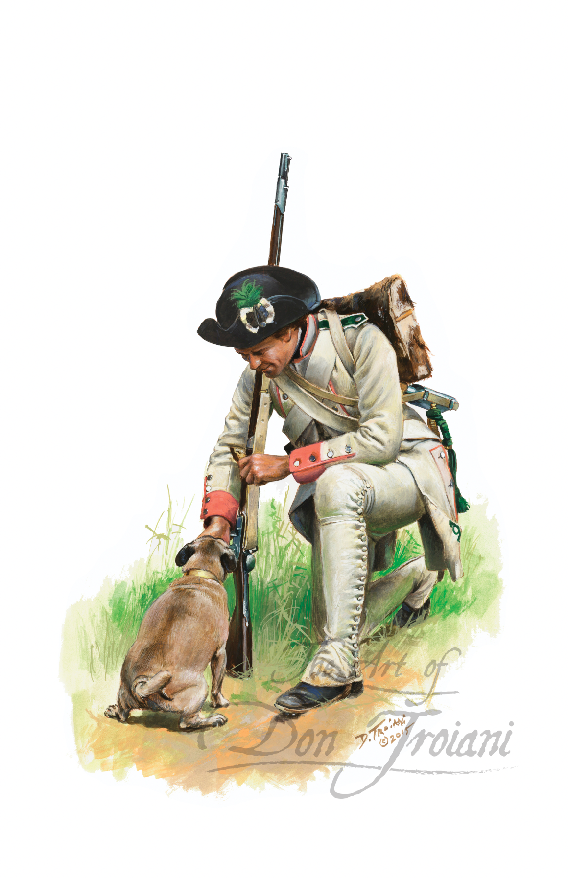 A Note From Don Troiani: "Here is a Chasseur of the French Touraine (34th) as he would have appeared at the time of the siege of Yorktown, Virginia. The dog wouldn't stop barking at the model so we tried letting him give her a treat . It wound up being an interesting pose. You can see the dog is taking the treat but is ready to spring back and bark some more. This dog is not easily bought off!"
