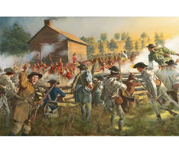The Whigs then turned their attention on the New York Volunteers who were camped in Williamson’s Lane. The Volunteers were Provincial infantry well trained in the bayonet charge, but they were hemmed in by the fences running along both sides of the lane and could not maneuver effectively. They quickly began taking casualties from the Whigs’ rifle fire and, seeing the hopelessness of their position, grounded their arms and surrendered. The Whigs under Bratton and Neel then advanced on the British Legion dragoons, who were camped behind Williamson’s house.