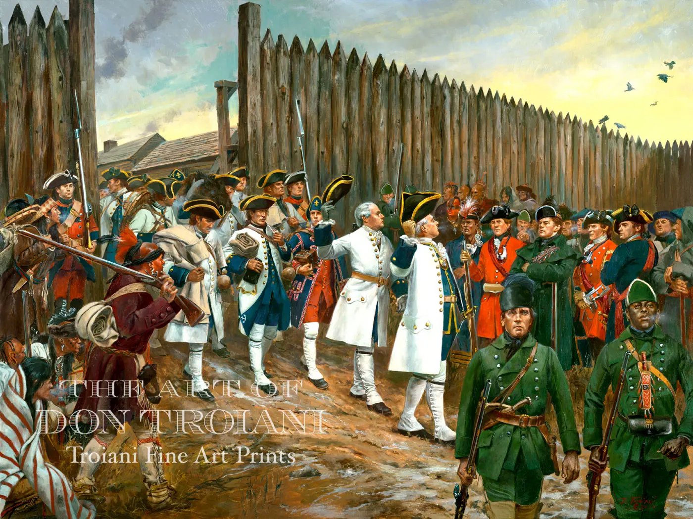 In late 1760's the French and Indian war came to a close as the French surrendered Montreal and all of their other frontier posts to the British. Major Robert Rogers, with a detachment of his famed Rangers and a company of the Royal American Regiment, were charged with supervising the crown jewel of these posts - Detroit. "The French garrison laid down their arms, English colors were hoisted and the French taken down, at which time about 700 Indians who were observing all this gave a huge and merry shout." The French garrison then left Detroit with an escort of rangers to be taken to Pittsburgh and, eventually to Europe. This is the moment shown in the painting, an event full of eighteenth century courtesy worthy of any European palace, but taking place on the North American frontier. For the occasion, the troops would have been in their best regulation dress: the French wearing their gray-white and blue uniforms, the rangers in green and the soldiers of the 60th in red coats.